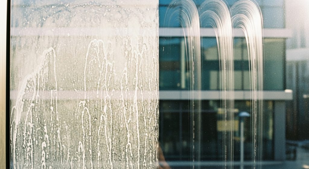 Many property owners attempt DIY solutions, such as vinegar, baking soda, or commercial glass cleaners. While these can help in minor cases, they often fall short for persistent or heavy mineral deposits. Vinegar may remove some calcium buildup, but it can leave streaks if not rinsed properly. Abrasive powders or scrubbing pads risk scratching the glass surface, leading to permanent damage.